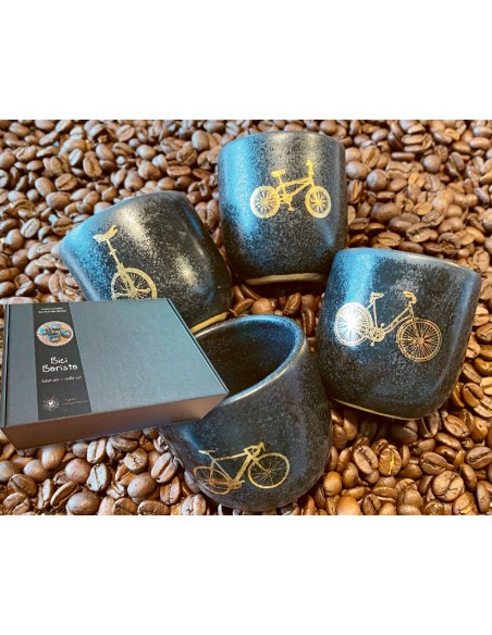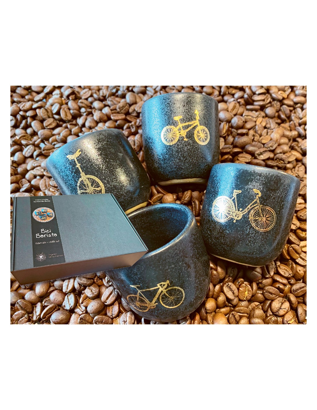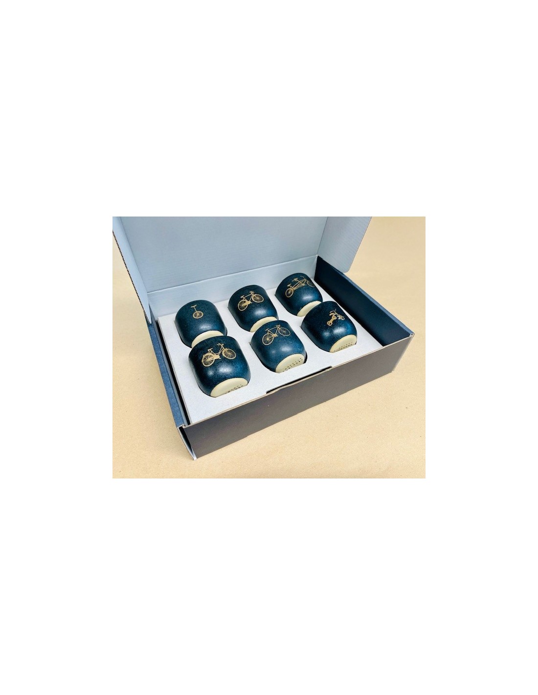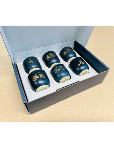 Die stilvollen Espresso-Bici-Becher aus der Keramikwerkstatt der Brühlgut Stiftung in Winterthur. 6 Becher in dekorativer Geschenkpackung mit unterschiedlichen Sujets.