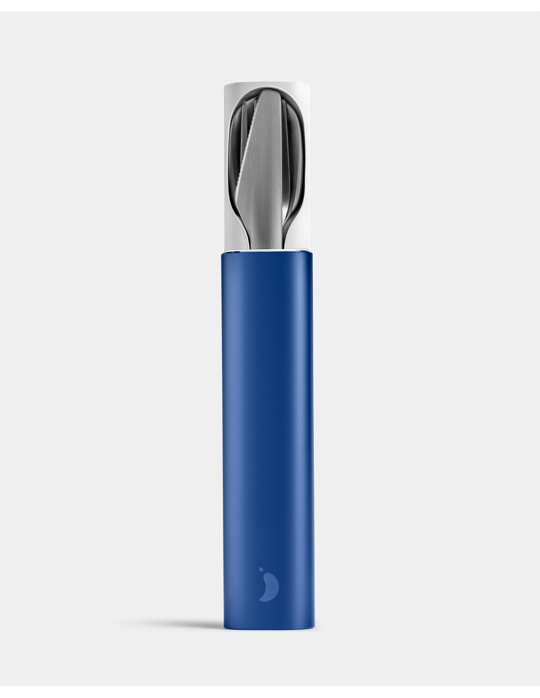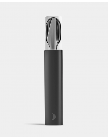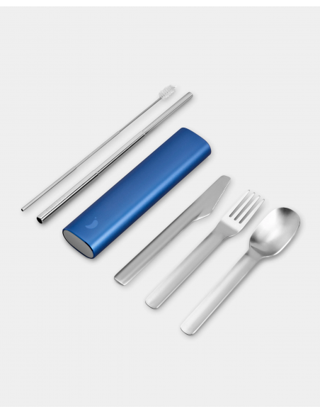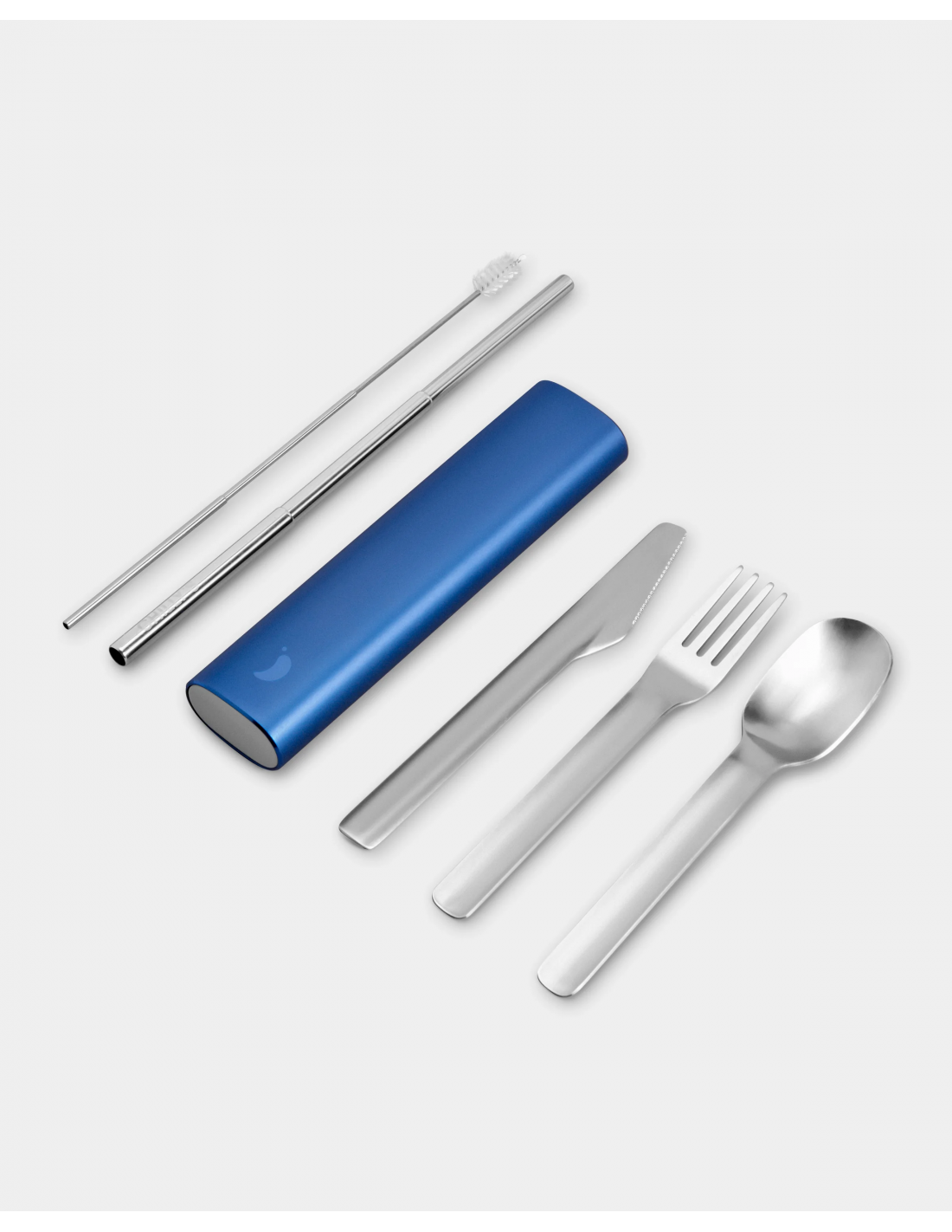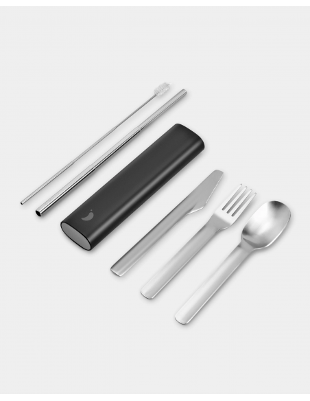 • Contient une fourchette en acier inoxydable, un couteau tranchant, une cuillère et une paille télescopique pour boissons froides.